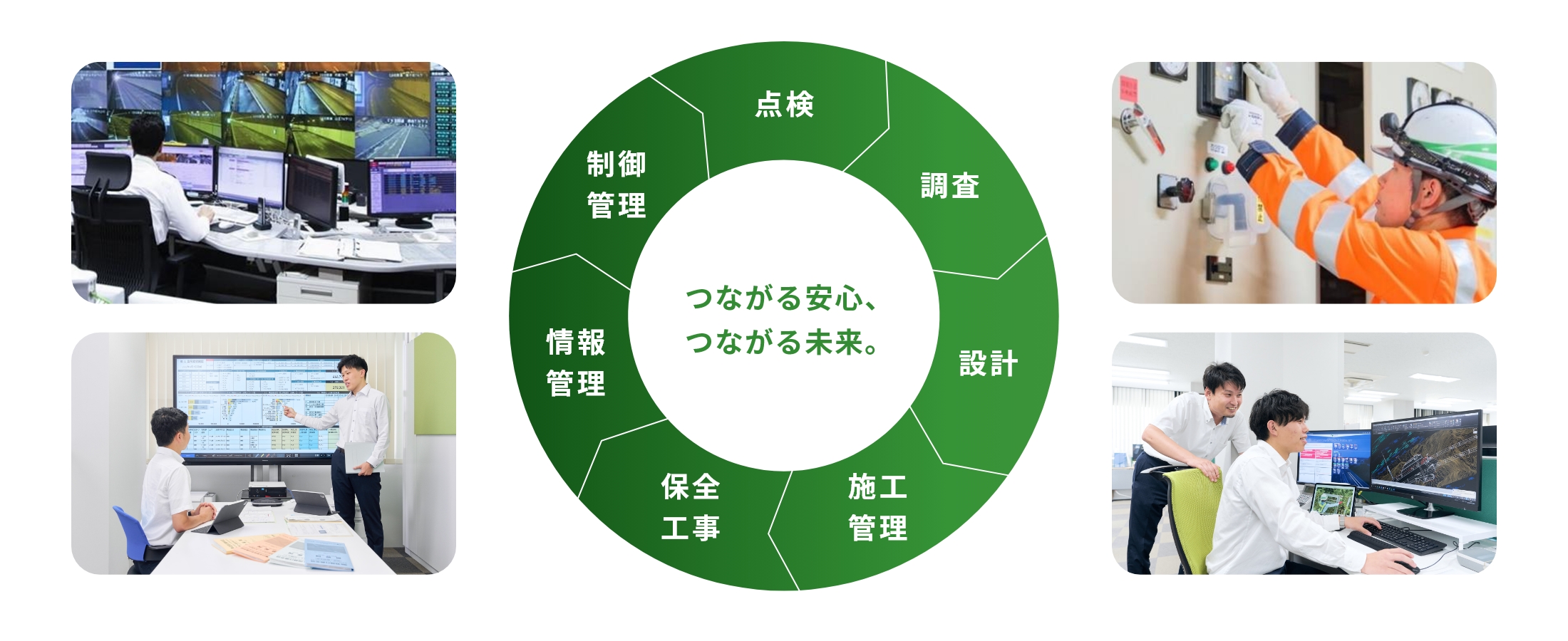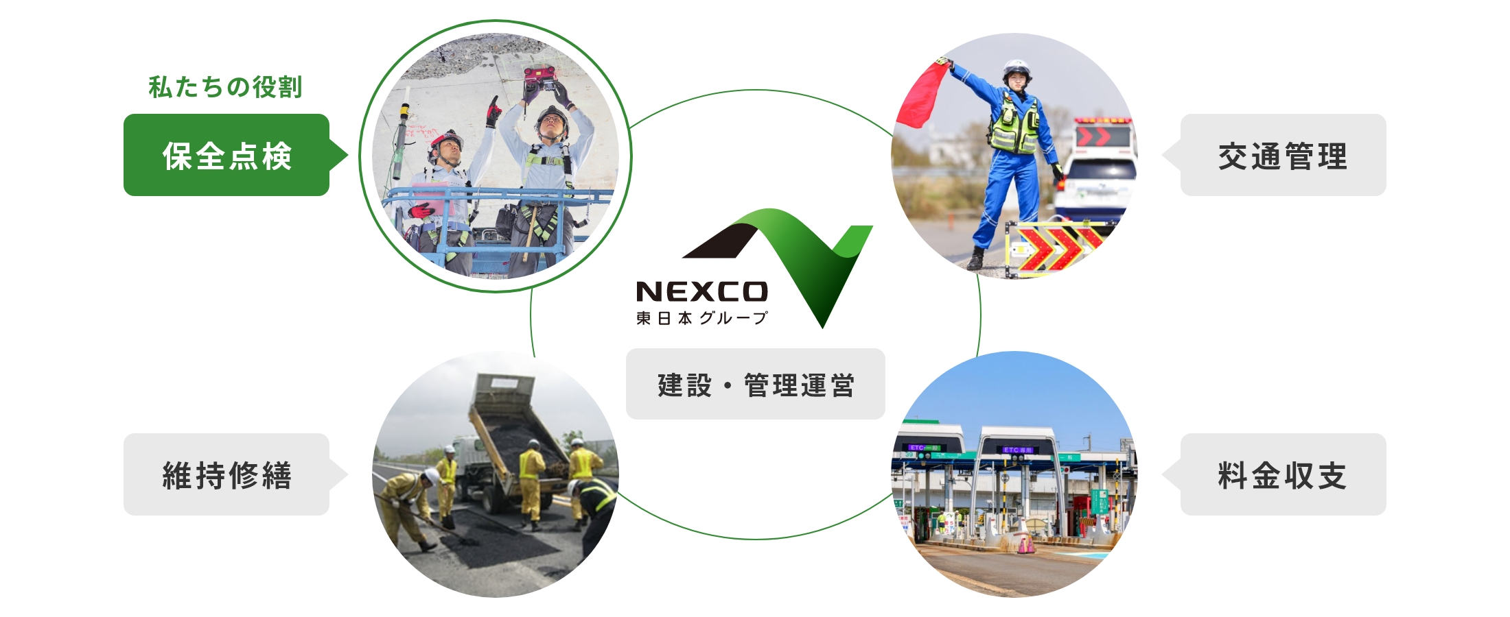 高速道路の維持管理業務は大きく分けて以下の4つに分類され、NEXCO東日本のグループ会社が役割を分担しています。この中で、私たちネクスコ・エンジニアリング新潟が担っているのが、「保全点検」です。
