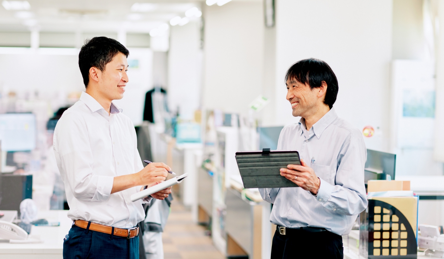 今回は本社土木事業部・土木管理部・土木管理課のおふたり。キャリア入社16年目の今井さんと、新卒入社7年目の刈谷さんです。刈谷さんは同事業部内の土木計画部・保全計画課兼務ですが、上司である今井さんの配慮に助けられているとのこと。お話を伺うと、おふたりの穏やかな信頼関係が見えてきました。