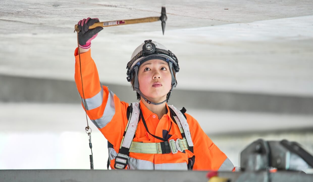 高速道路の点検は、人でいえば健康診断。点検ハンマーによる打音と触診でわずかな異変を見抜き、その後、調査や修理・修繕などを担当する部署へリレーします。安全管理のスタートなので「見逃さないこと」が信条です。
