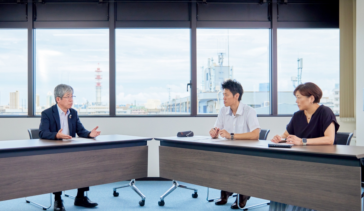 この記事は、普段あまり話す機会のない経営者層と社員とが、ざっくばらんな会話を通して、経営者の皆さんのお考えやご経験を共有させていただくコーナーです。今回は今年2023(令和5)年6月に当社の代表取締役社長に就任された植松社長にインタビュー。聞き手は昨年春、コーポレート部門に異動となった、企画課の大嶋さんと調整課の縄さんです。