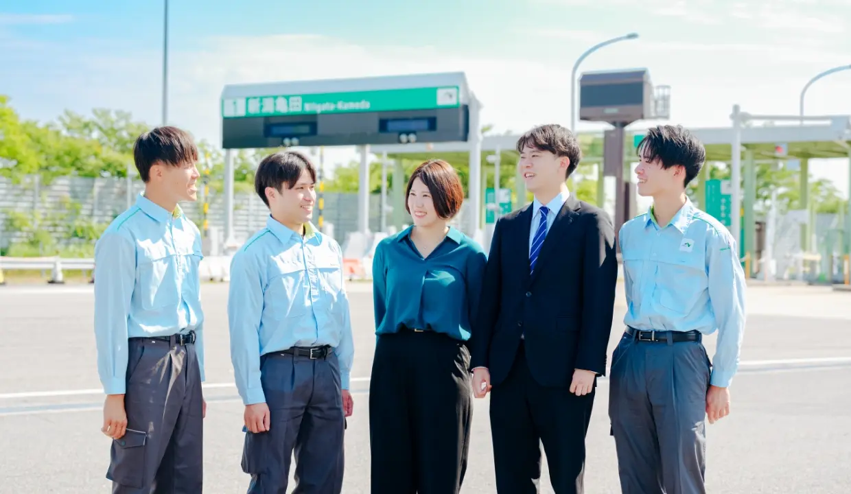 新潟と全国を結ぶ高速道路をそれぞれの部署で守り続けている、若手社員5名が集結。