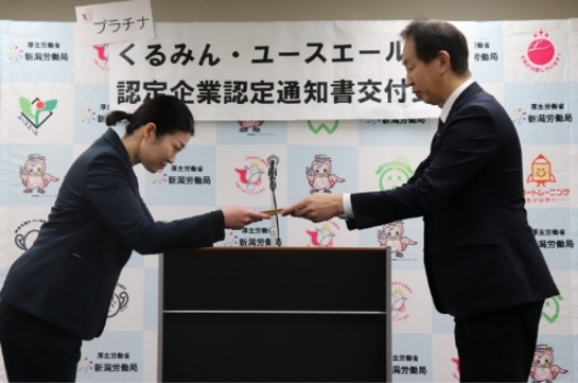 2025年1月15日付けで新潟労働局より、「子育てサポート企業」として高い水準で取り組む企業であることが認められ、「プラチナくるみん」を取得しました。