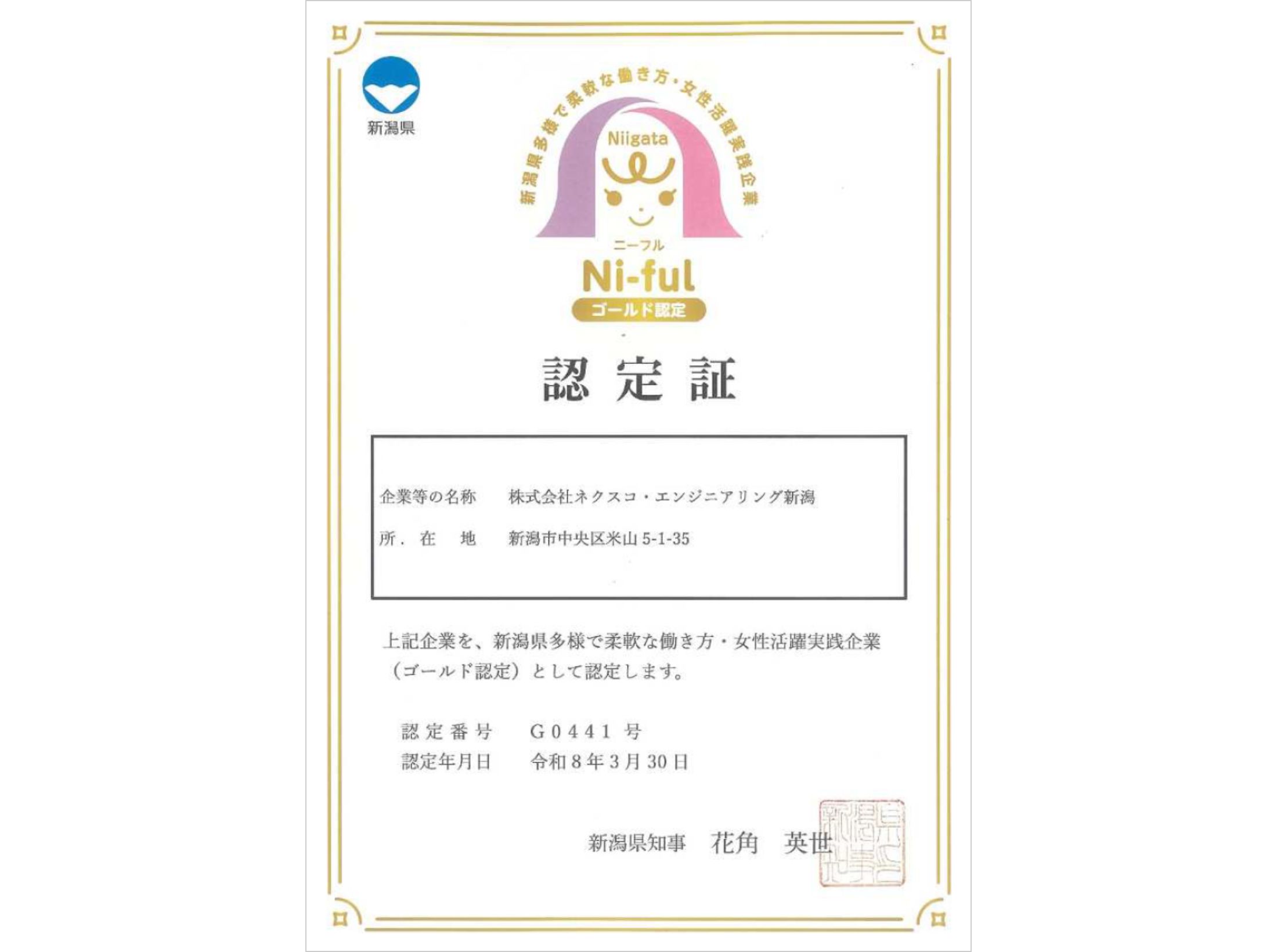 2026年3月30日付で新潟県より、多様で柔軟な働き方の推進や仕事と家庭・その他の活動の両立支援、女性の登用・育成などに積極的に取り組む企業であると認められ、Ni-ful(ニーフル)ゴールド企業に認定されました。