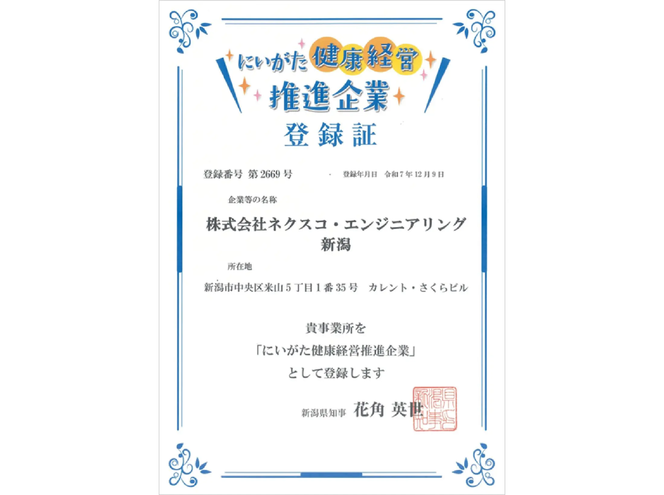 従業員等の健康づくりに積極的に取り組む企業として、2025年12月9日に新潟県の「にいがた健康経営推進企業」に登録されました。